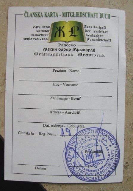Mitgliedskarte der "Serbisch - Deutschen Freundschaft" in Mramorak